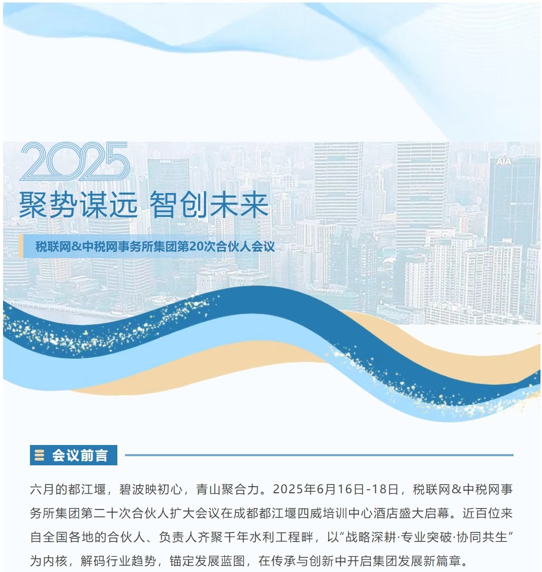 2025年6月16日-18日,税联网&中税网事务所集团第二十次合伙人扩大会议在成都都江堰四威培训中心酒店盛大启幕。